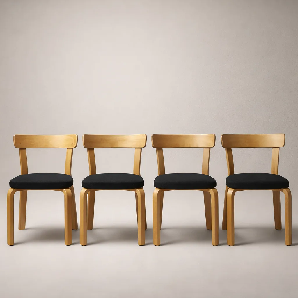 Neljä Artek Tuoli 69 -tuolia Kvadrat Hallingdal -verhoilulla. Alvar Aallon klassinen design. Tuolit ovat erinomaisessa kunnossa, sopivat täydellisesti moderniin kotiin.