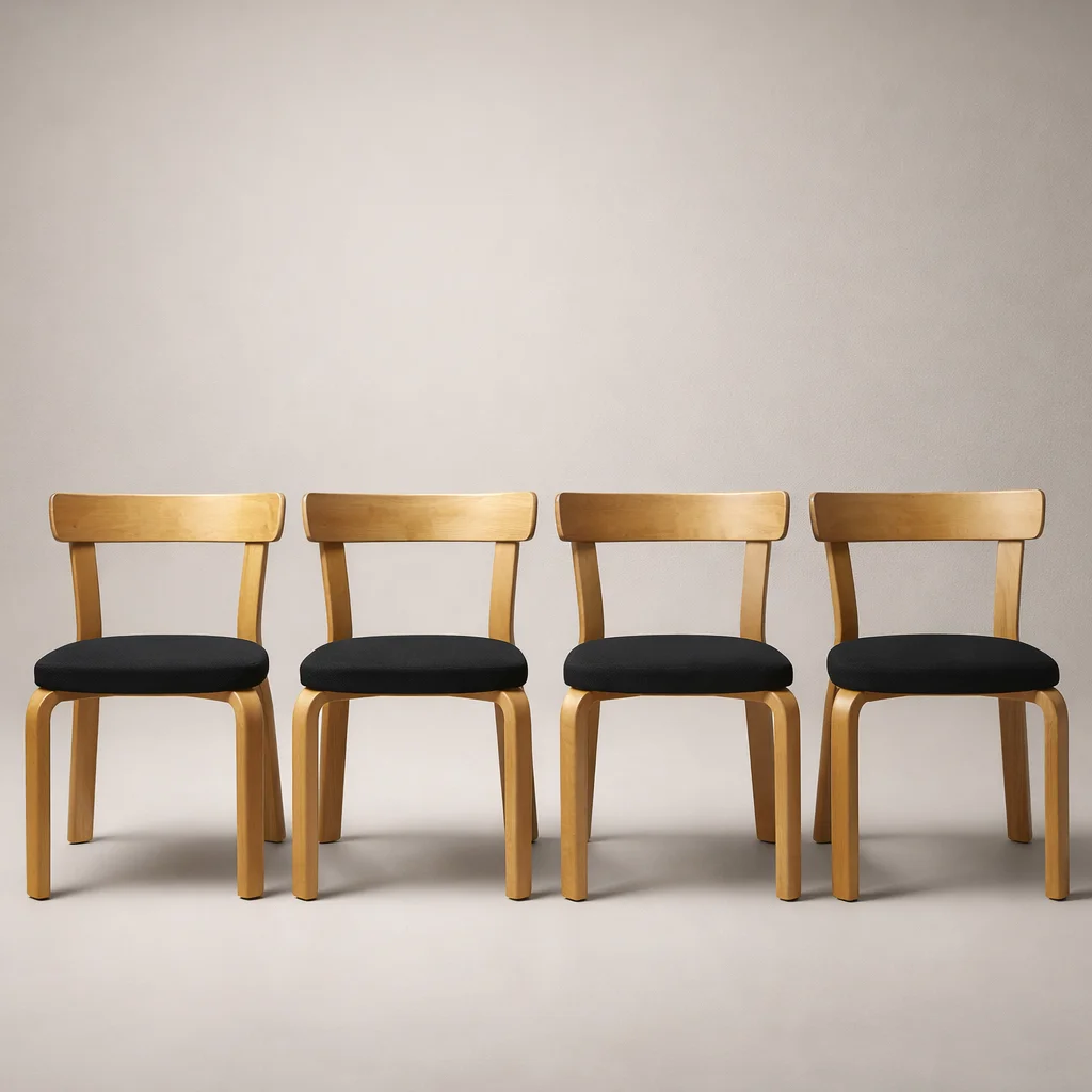 Neljä Artek Tuoli 69 -tuolia Kvadrat Hallingdal -verhoilulla. Alvar Aallon klassinen design. Tuolit ovat erinomaisessa kunnossa, sopivat täydellisesti moderniin kotiin.