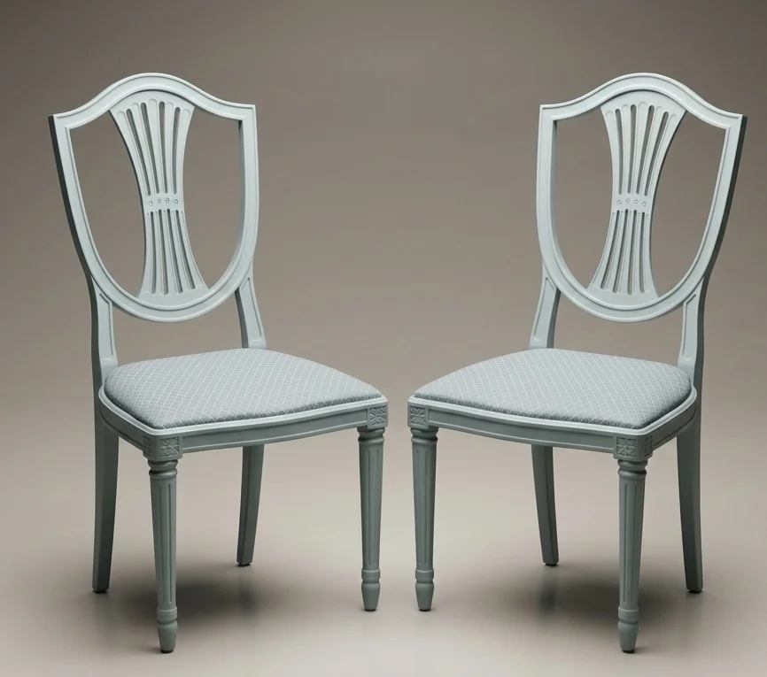 Kaksi 1960-luvun Hepplewhite-tyylistä tuolia. Klassinen englantilainen design, elegantit linjat ja hienostunut ilme.